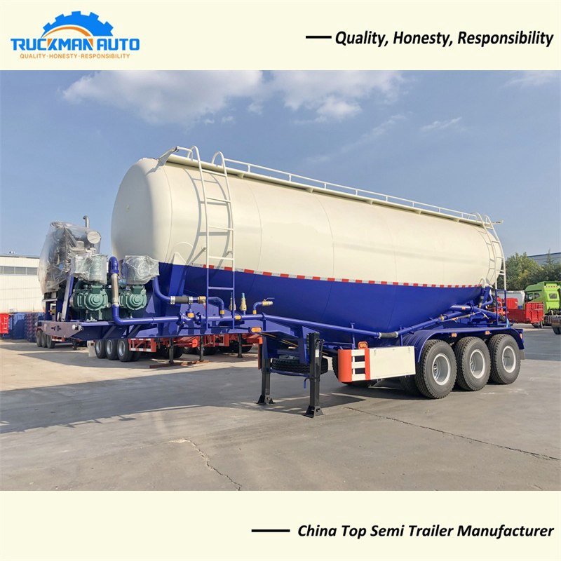 3 axles bulk powder cement tanker trailer mainly consists of tank body, frame, power system (diesel engine, air compressor), side and rear protection, electrical road system, travel structure, traction pin, walking platform, climbing ladder, manhole cover, unloading system, etc. The complete vehicle mainly consists of chassis, tank, power system (extractor, drive shaft, air compressor), electrical road system, walking platform, ladder, manhole cover, unloading system, etc.