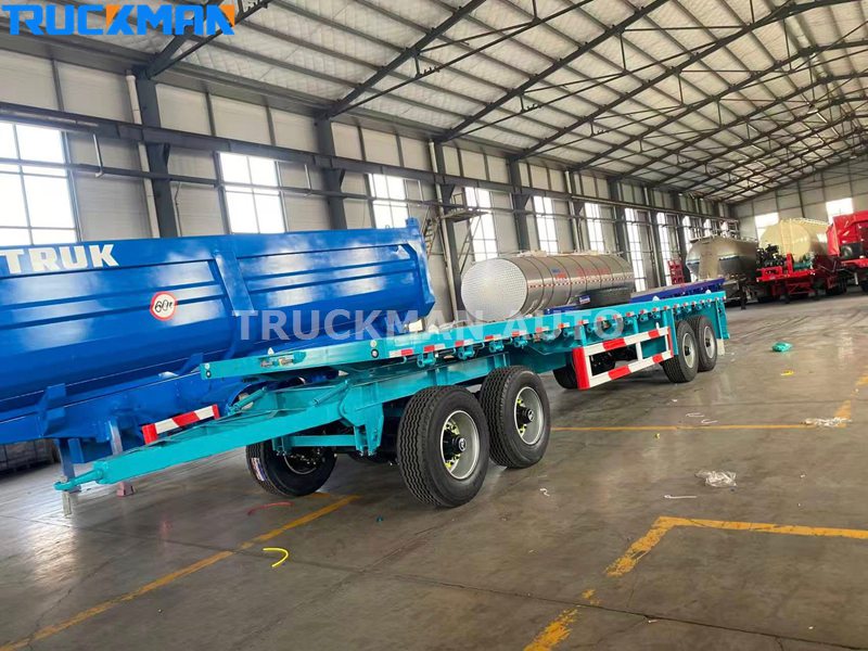 4 Axle 60 Tons Container Flatbed Full Trailer consists of two parts: a front bogie and a rear, thickened 2-axle semi-trailer body. This design significantly reduces its turning radius and improves its ability to navigate narrow intersections. The front bogie not only increases the overall steering capability but also supports the weight.