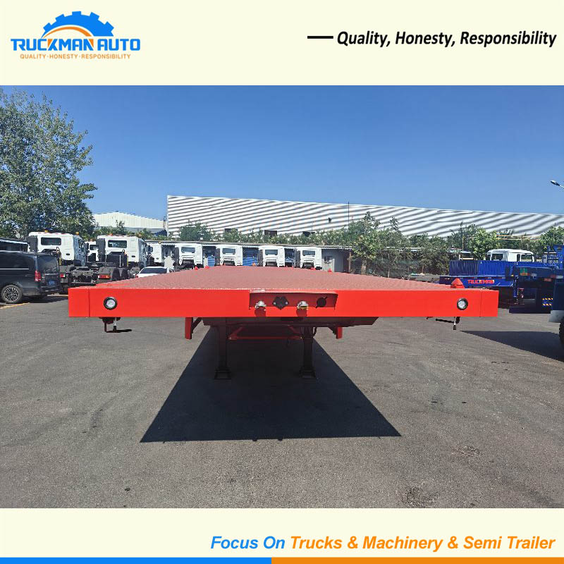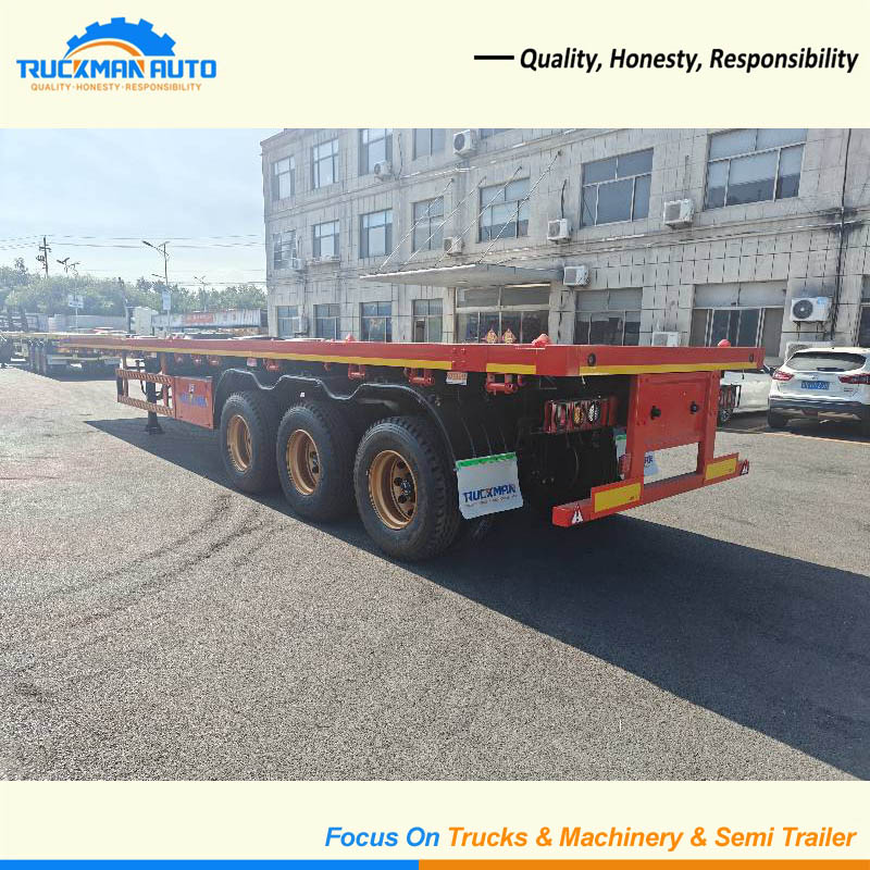 This 3 axle container flatbed semi-trailer is built tough for hauling heavy stuff-max 50 tons, perfect for carting container, construction materials. Its main frame is made of strong Q355 steel, with a thick anti-rust paint job that keeps it from rusting even in rainy or coastal areas, so it lasts longer. The 3 axles spread the weight evenly, so it stays steady when turning, and each axle has tough leaf spring suspension plus durable tires.