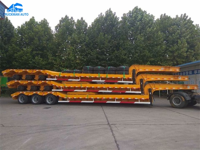 Low bed semi trailer used for the haulage heavy machinery, such as the bulldozer, excavator, loader etc. We have 40 tons, 50 tons, 70 tons, 100 tons model low bed trailer
