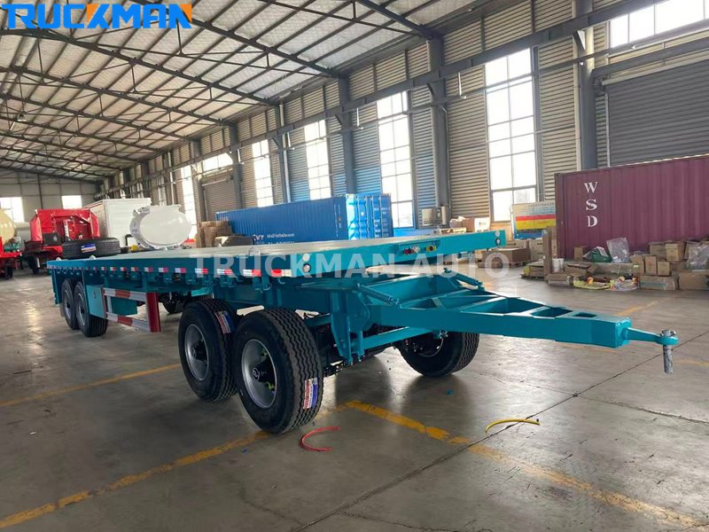 4 Axle 60 Tons Container Flatbed Full Trailer consists of two parts: a front bogie and a rear, thickened 2-axle semi-trailer body. This design significantly reduces its turning radius and improves its ability to navigate narrow intersections. The front bogie not only increases the overall steering capability but also supports the weight.