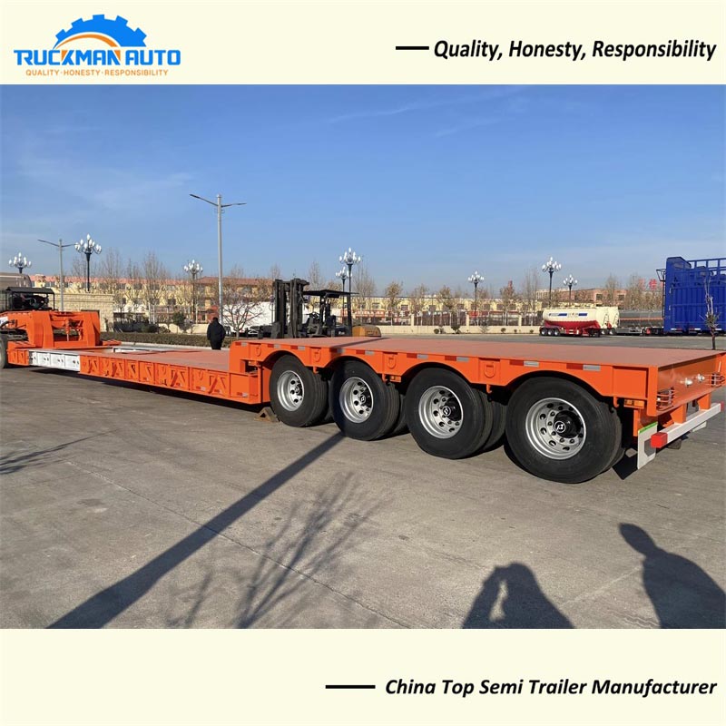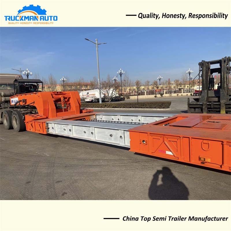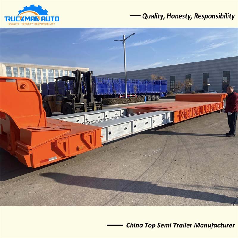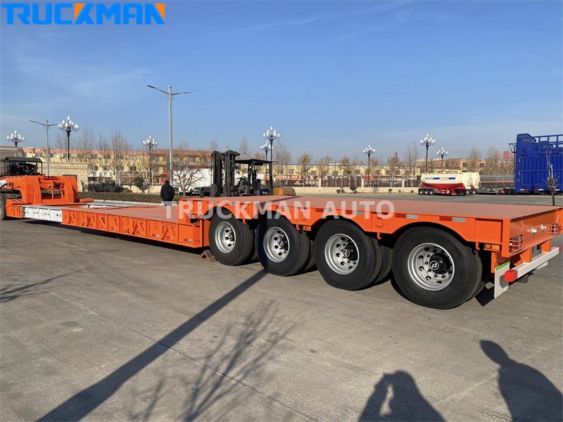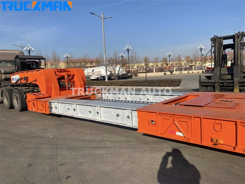 The low bed trailer is built with high strength steel, which is sturdy and durable; electrostatic powder spraying and baking paint process, which has beautiful appearance and high corrosion resistance; lightweight design, strong bearing capacity, and tested quality. The semi-trailer adopts a retractable form, which can increase the length of the flatbed and transport more goods. The semi-trailer can realize the width widening by extending the structural form to both sides, which can play a great role in certain large pieces of transportation, especially in the transportation of extra wide pieces, such as large construction machinery, mining vehicles and so on.