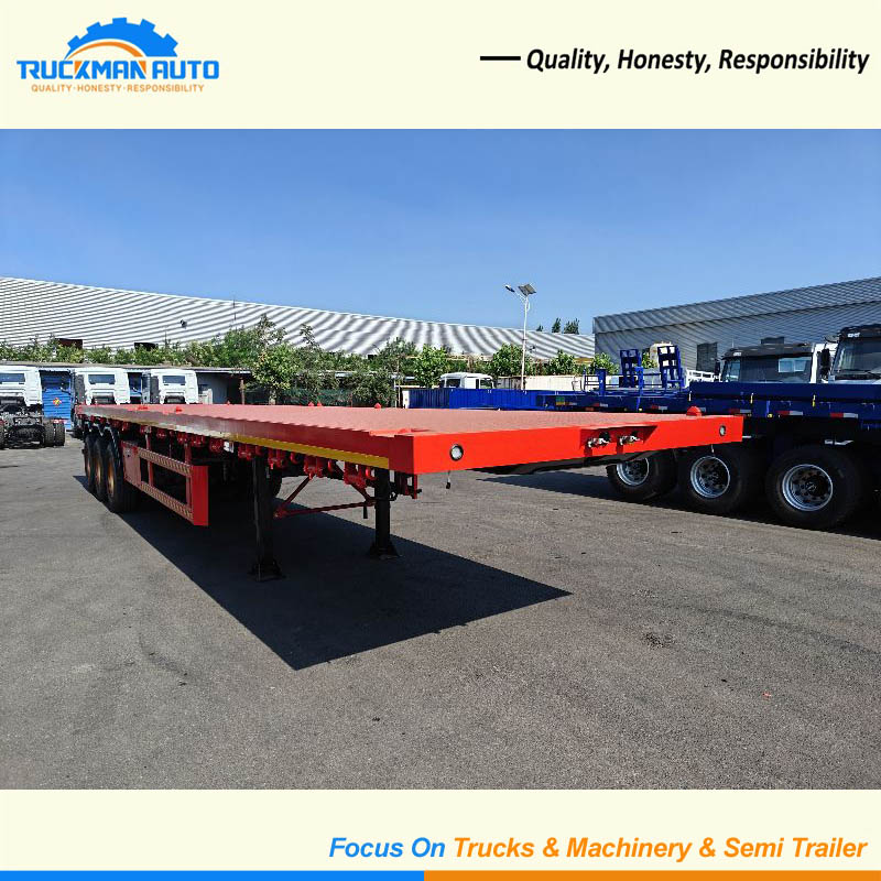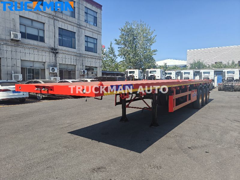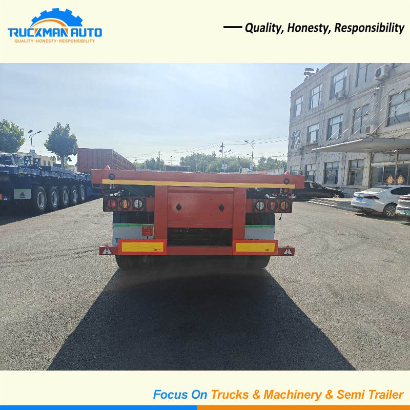 This 3 axle container flatbed semi-trailer is built tough for hauling heavy stuff-max 50 tons, perfect for carting container, construction materials. Its main frame is made of strong Q355 steel, with a thick anti-rust paint job that keeps it from rusting even in rainy or coastal areas, so it lasts longer. The 3 axles spread the weight evenly, so it stays steady when turning, and each axle has tough leaf spring suspension plus durable tires.